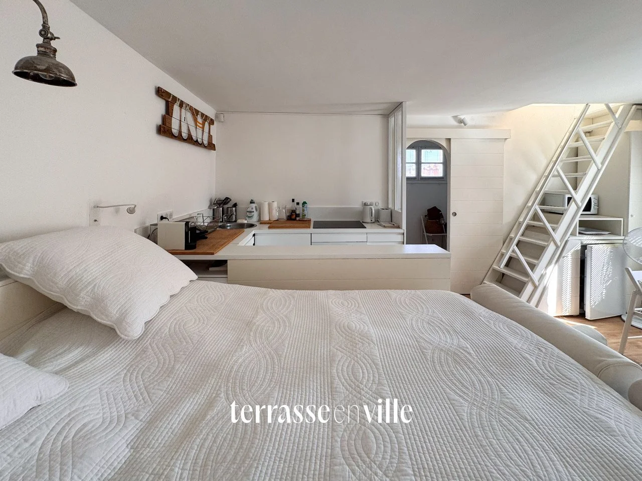 Dès l’entrée, vous découvrez un coin nuit cosy et plein de charme, parfaitement intégré à l’espace. L’appartement, en parfait état, se compose ensuite d’une agréable pièce à vivre climatisée, comprenant une cuisine entièrement équipée ouverte sur un espace salon avec table à manger, idéal pour recevoir ou profiter d’un moment de détente. Une salle d’eau avec WC complète ce bien.